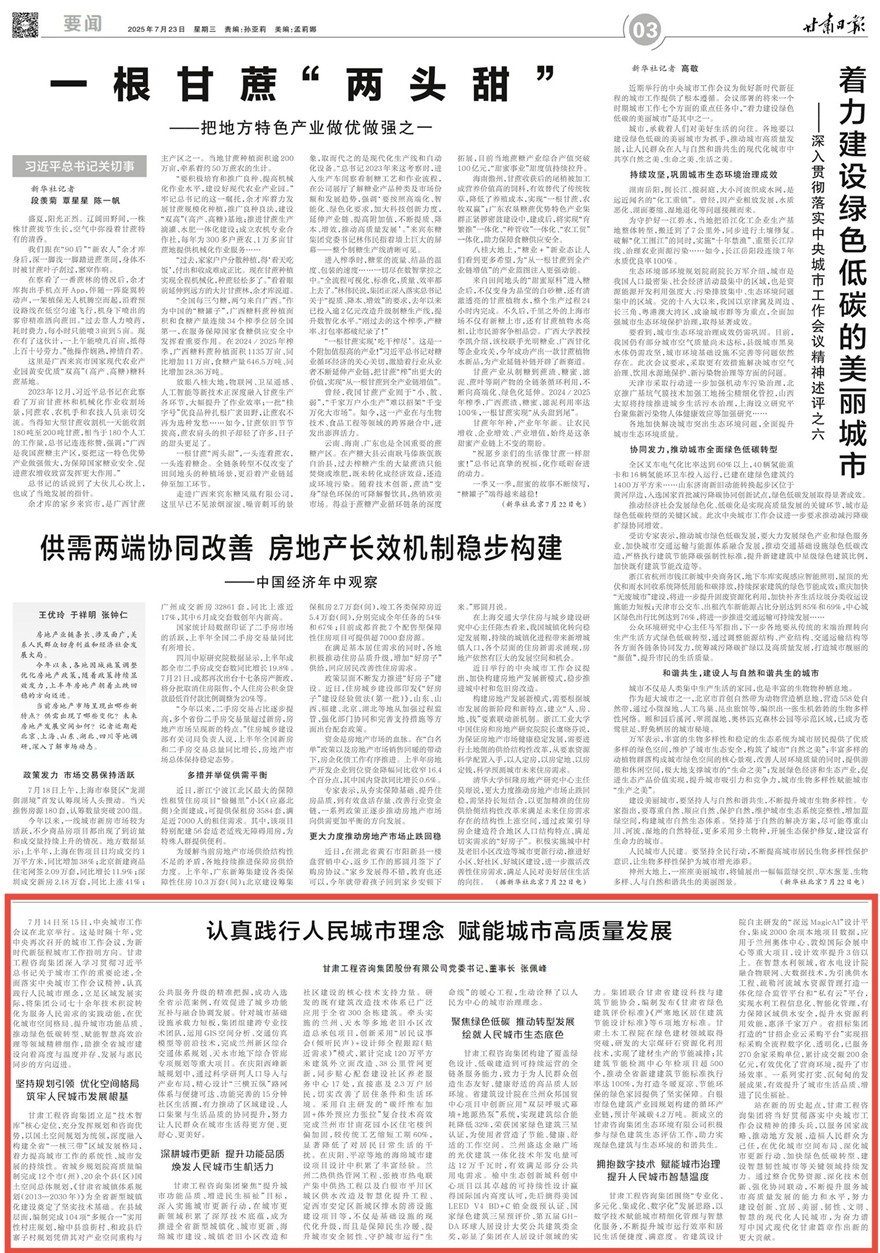 甘肅工程咨詢集團(tuán)黨委書(shū)記、董事長(zhǎng)張佩峰:認(rèn)真踐行人民城市理念 賦能城市高質(zhì)量發(fā)展 2025-07-23 7月14日至15日,中央城市工作會(huì)議在北京舉行。這是時(shí)隔十年,黨中央再次召開(kāi)的城市工作會(huì)議,為新時(shí)代新征程城市工作指明方向。甘肅工程咨詢集團(tuán)深入學(xué)習(xí)貫徹習(xí)近平總書(shū)記關(guān)于城市工作的重要論述,全面落實(shí)中央城市工作會(huì)議精神,認(rèn)真踐行人民城市理念,立足區(qū)域發(fā)展實(shí)際,將集團(tuán)公司七十余年技術(shù)積淀轉(zhuǎn)化為服務(wù)人民需求的實(shí)踐動(dòng)能,在優(yōu)化城市空間格局、提升城市功能品質(zhì)、推動(dòng)綠色低碳轉(zhuǎn)型、賦能智慧高效治理等領(lǐng)域精耕細(xì)作,助推全省城市建設(shè)...